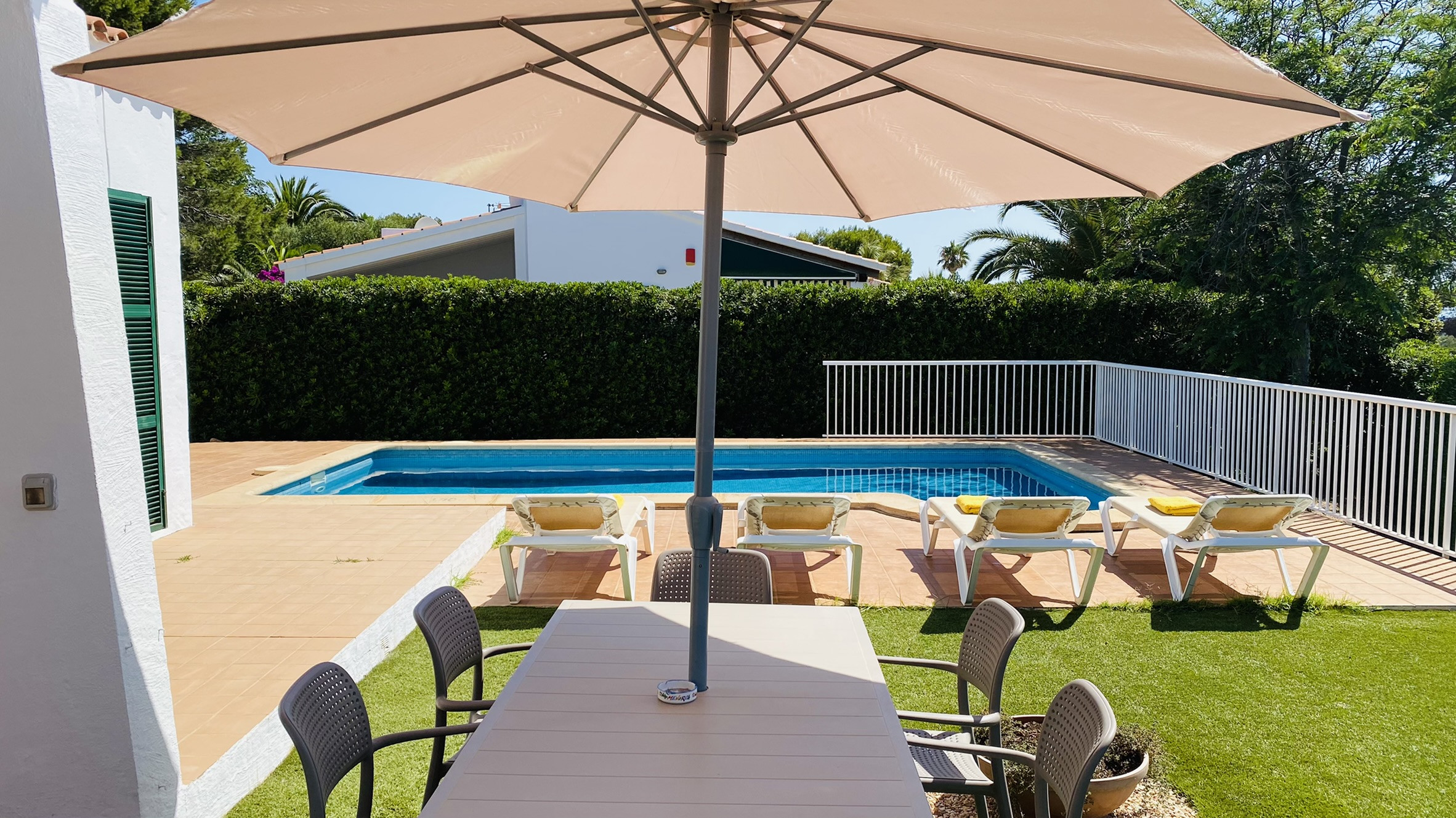 Directamente conectado al salón hay un porche cubierto con una mesa y sillas para comer al aire libre, así como sofás para relajarse a la sombra. La piscina está rodeada de una terraza para tomar el sol. Al otro lado del jardín hay una zona de césped con plantas autóctonas. También hay una barbacoa disponible.