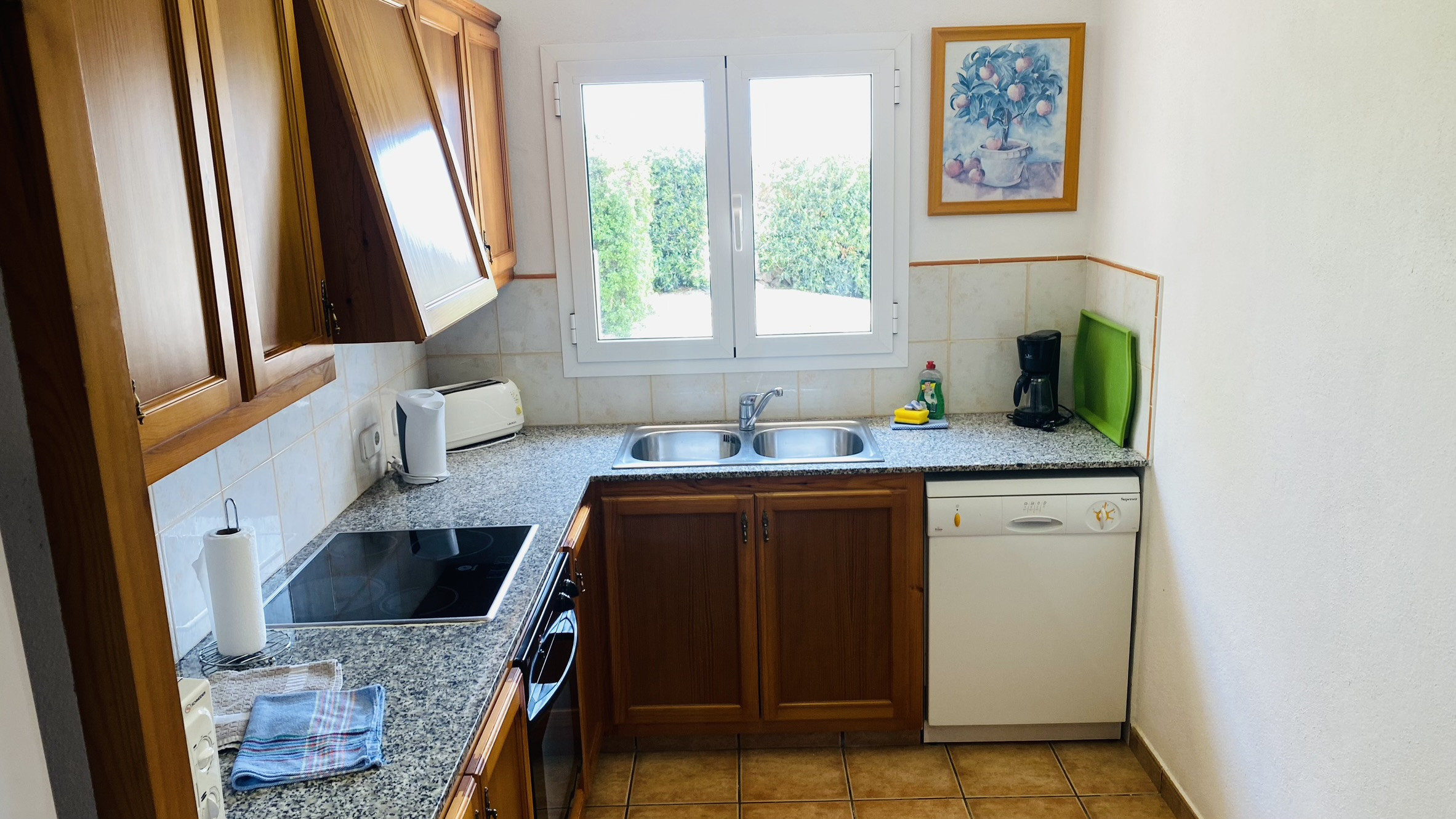 Los muebles son cómodos y funcionales y la cocina está bien equipada con frigorífico/congelador, lavadora, lavavajillas, horno, microondas, tostadora y hervidor.