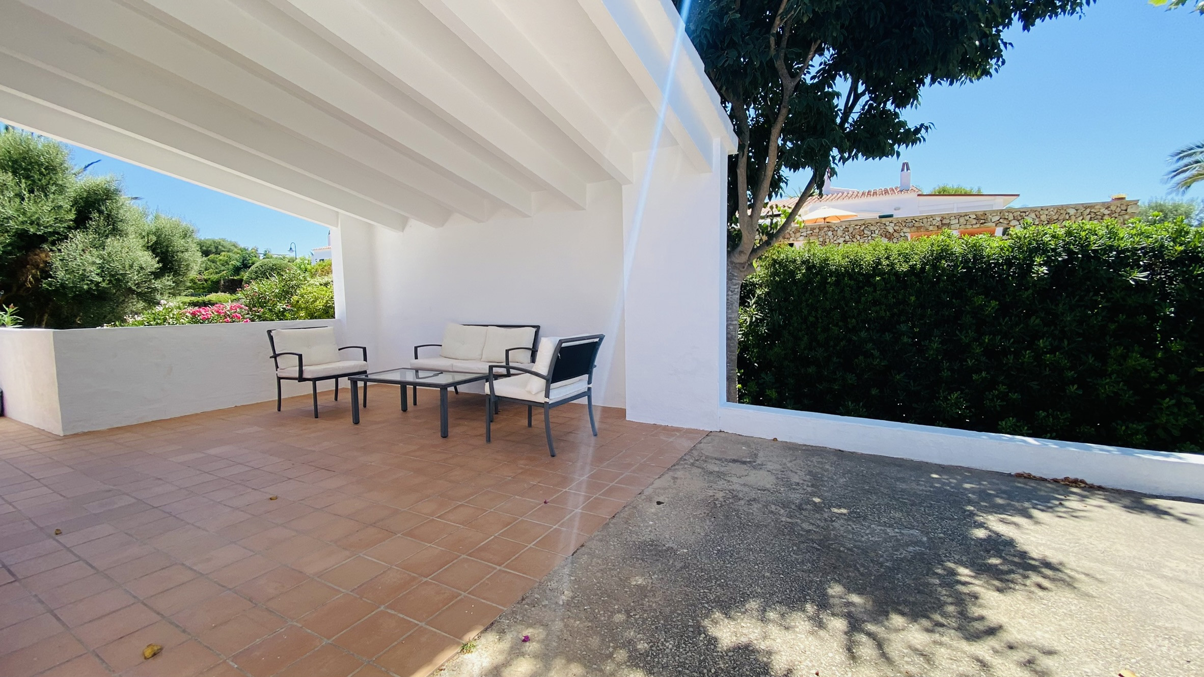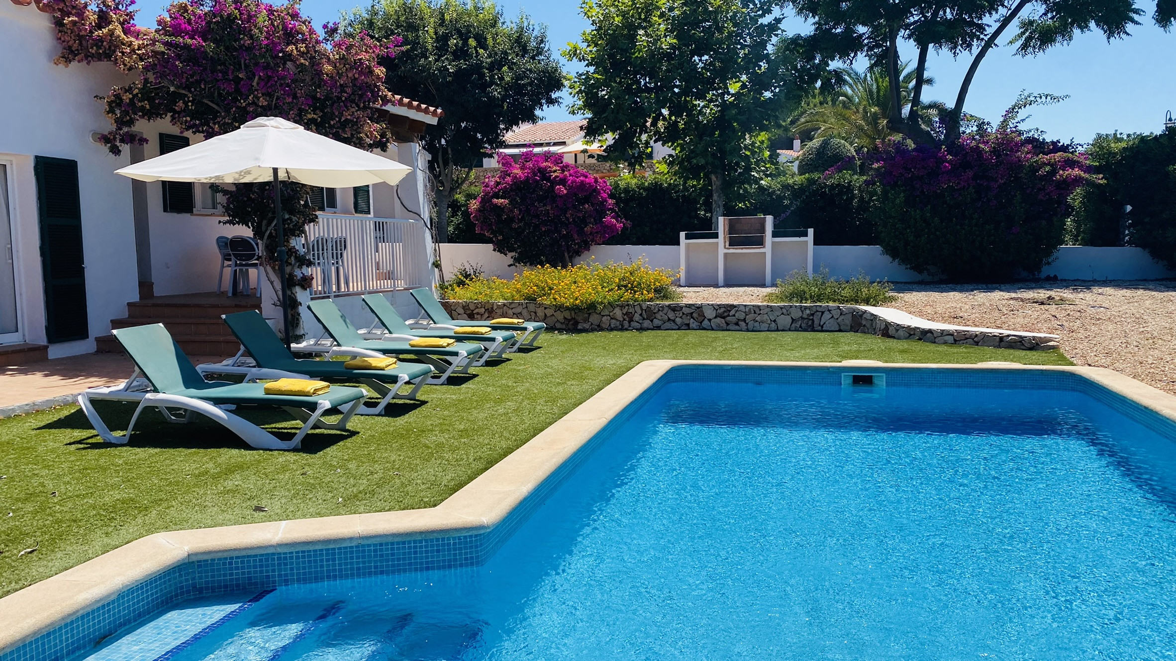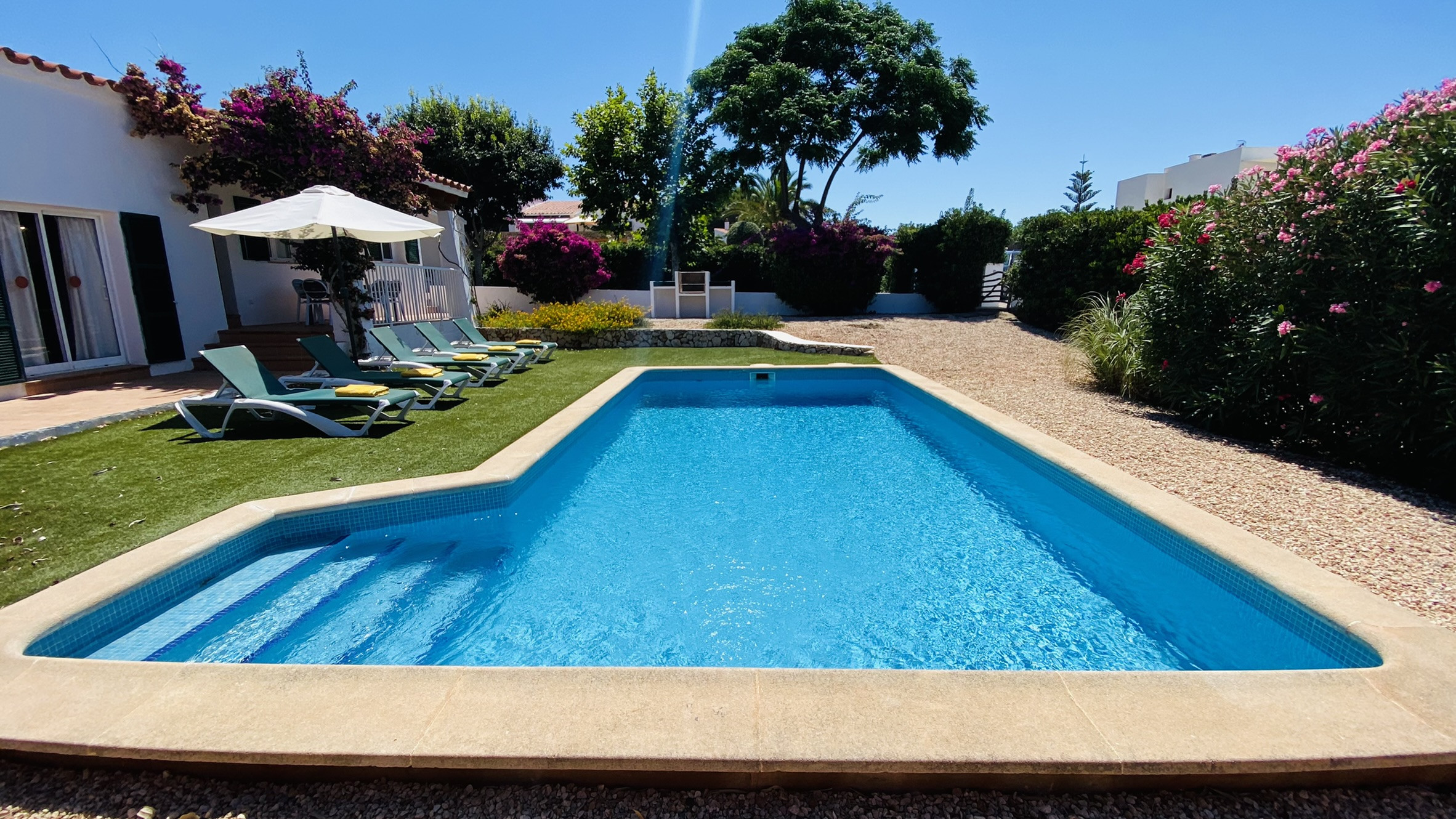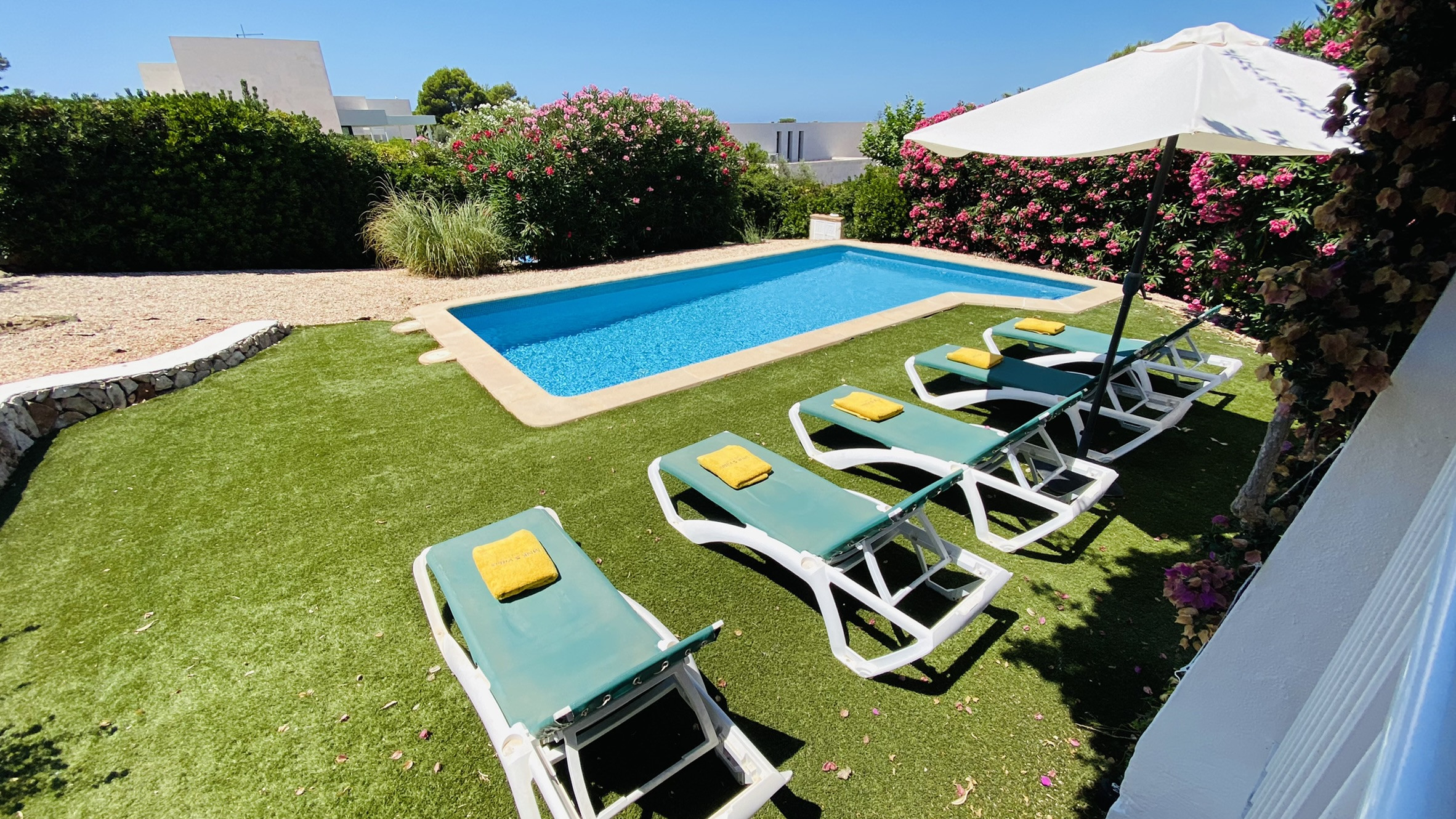 Directamente conectado al salón hay un porche cubierto con una mesa y sillas para comer al aire libre, así como sofás para relajarse a la sombra. La piscina está rodeada de una terraza para tomar el sol. Al otro lado del jardín hay una zona de césped con plantas autóctonas. También hay una barbacoa disponible.