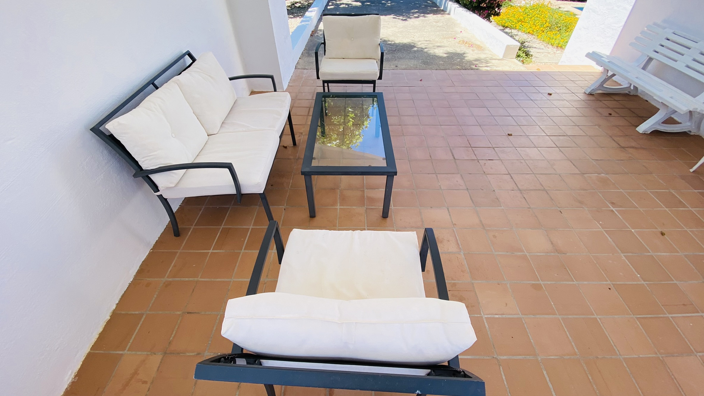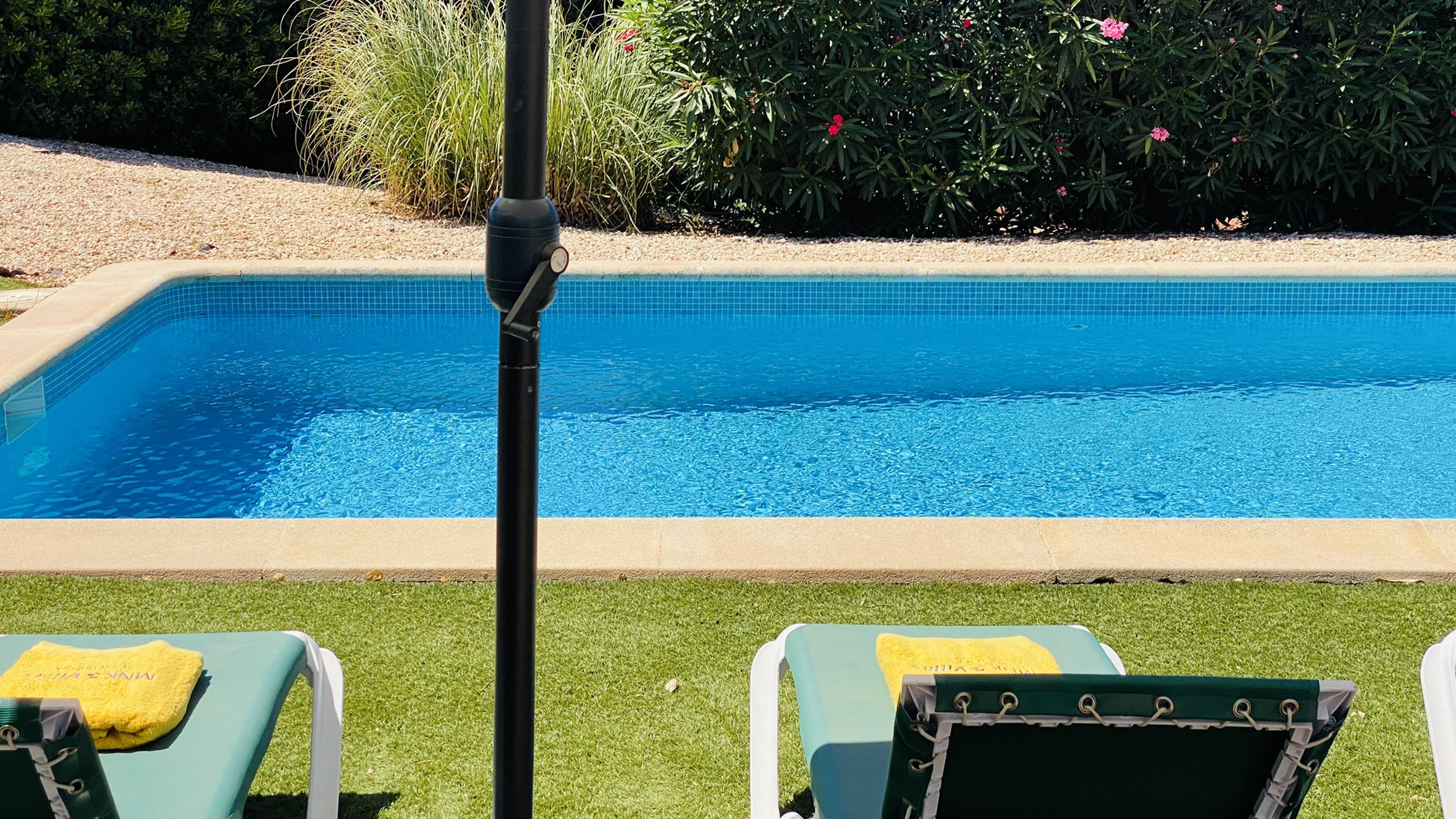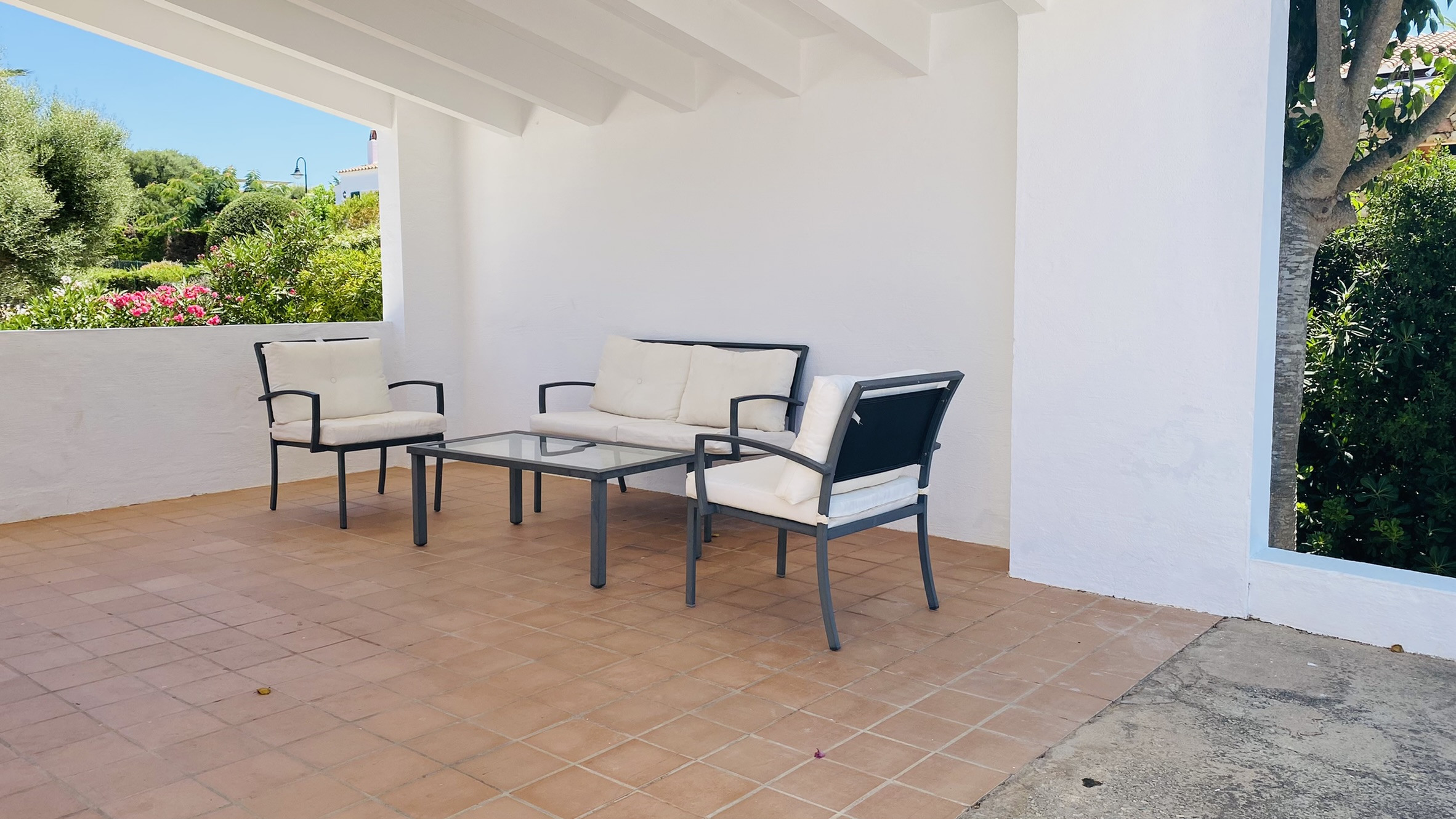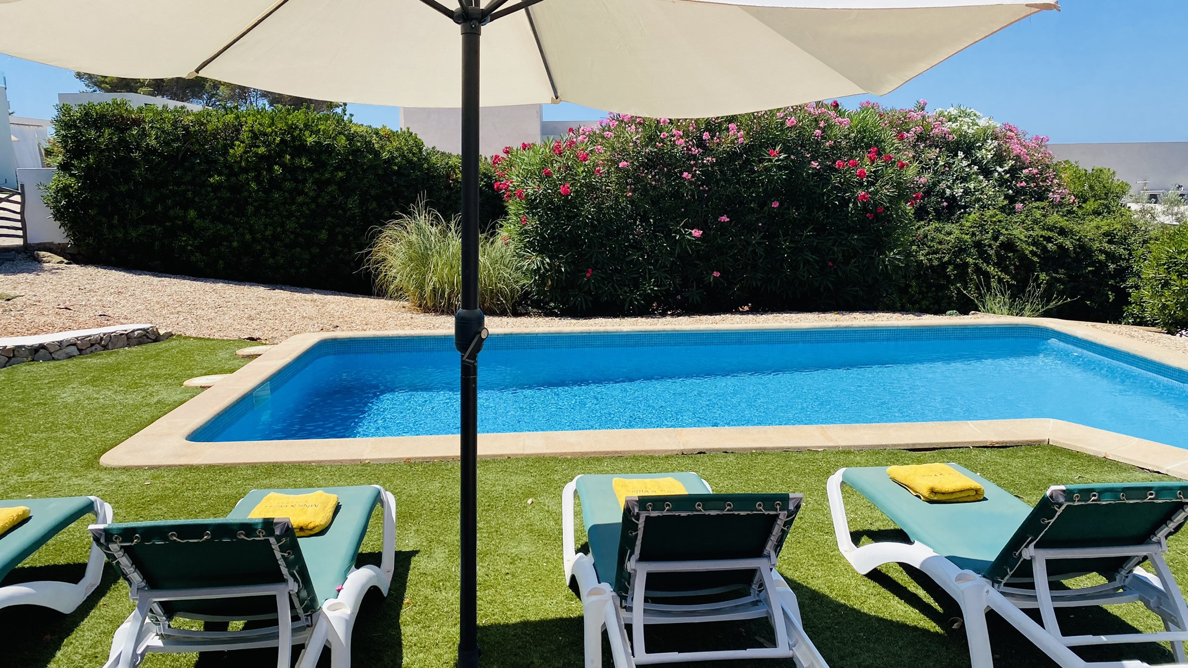 Directamente conectado al salón hay un porche cubierto con una mesa y sillas para comer al aire libre, así como sofás para relajarse a la sombra. La piscina está rodeada de una terraza para tomar el sol. Al otro lado del jardín hay una zona de césped con plantas autóctonas. También hay una barbacoa disponible.