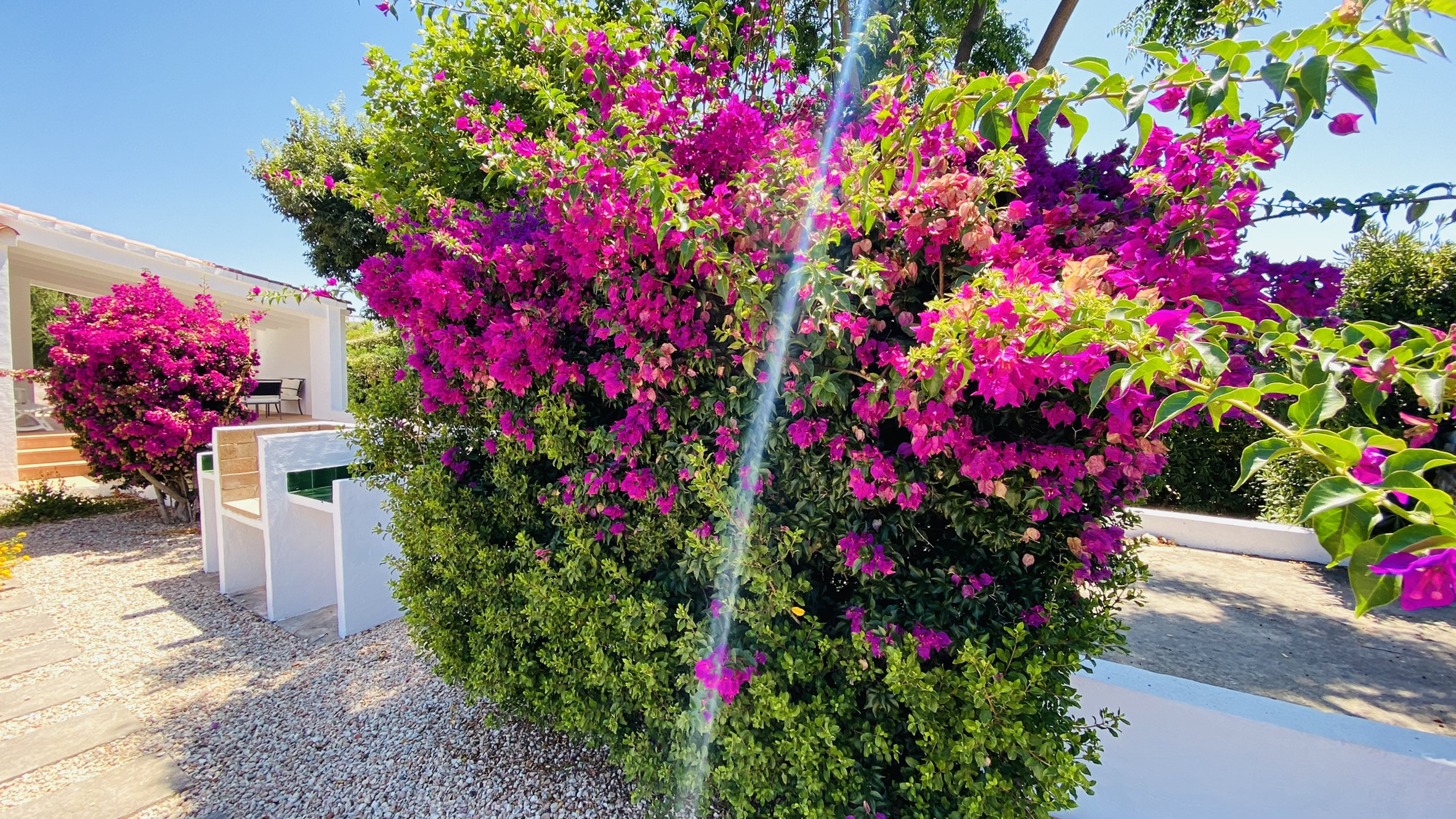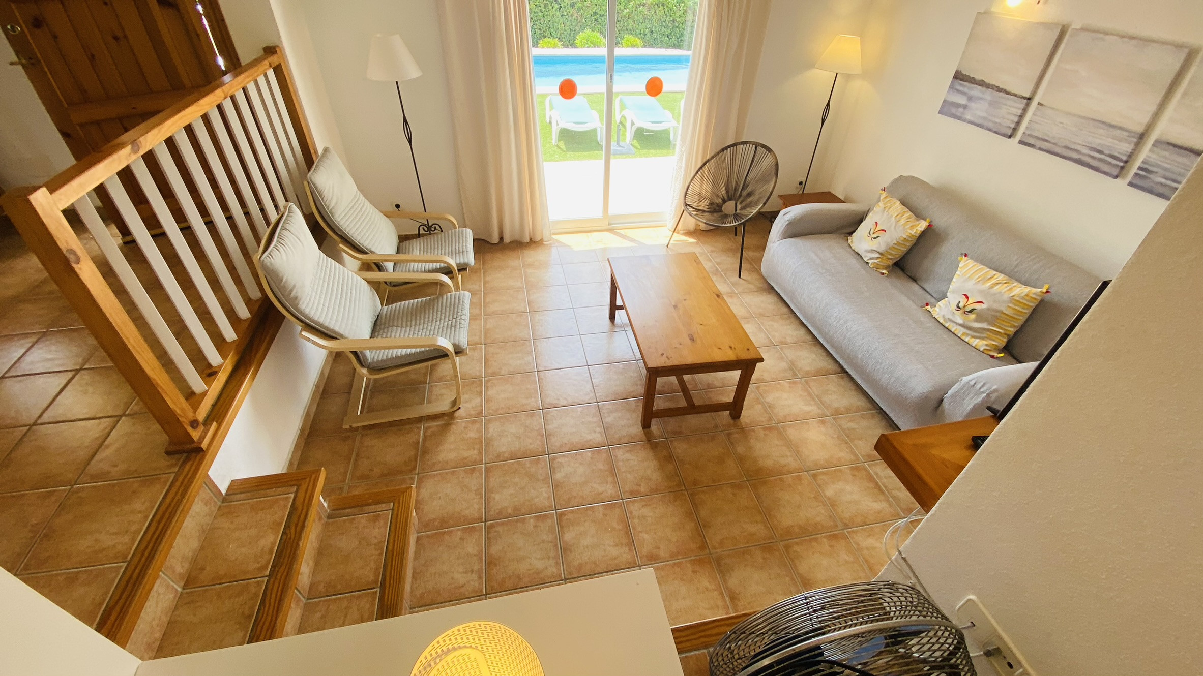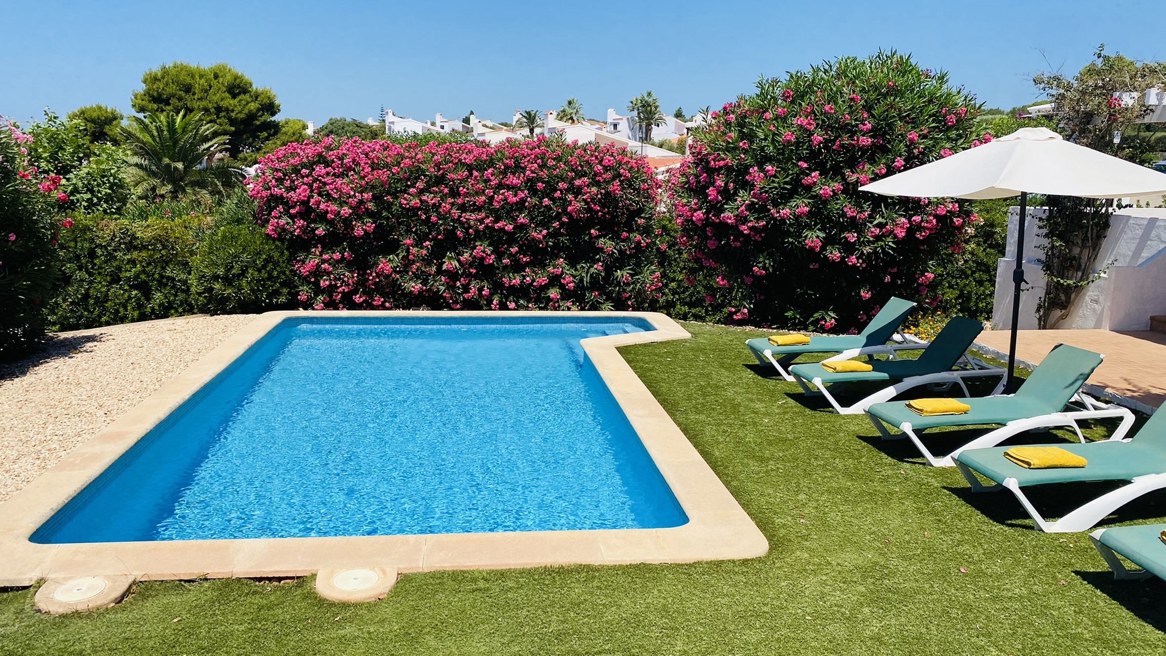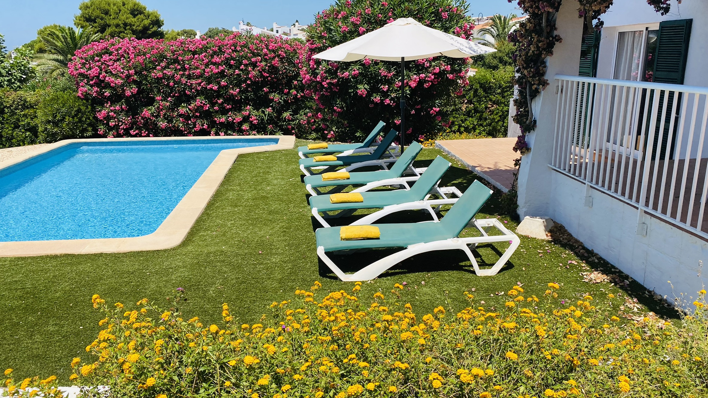 Directamente conectado al salón hay un porche cubierto con una mesa y sillas para comer al aire libre, así como sofás para relajarse a la sombra. La piscina está rodeada de una terraza para tomar el sol. Al otro lado del jardín hay una zona de césped con plantas autóctonas. También hay una barbacoa disponible.