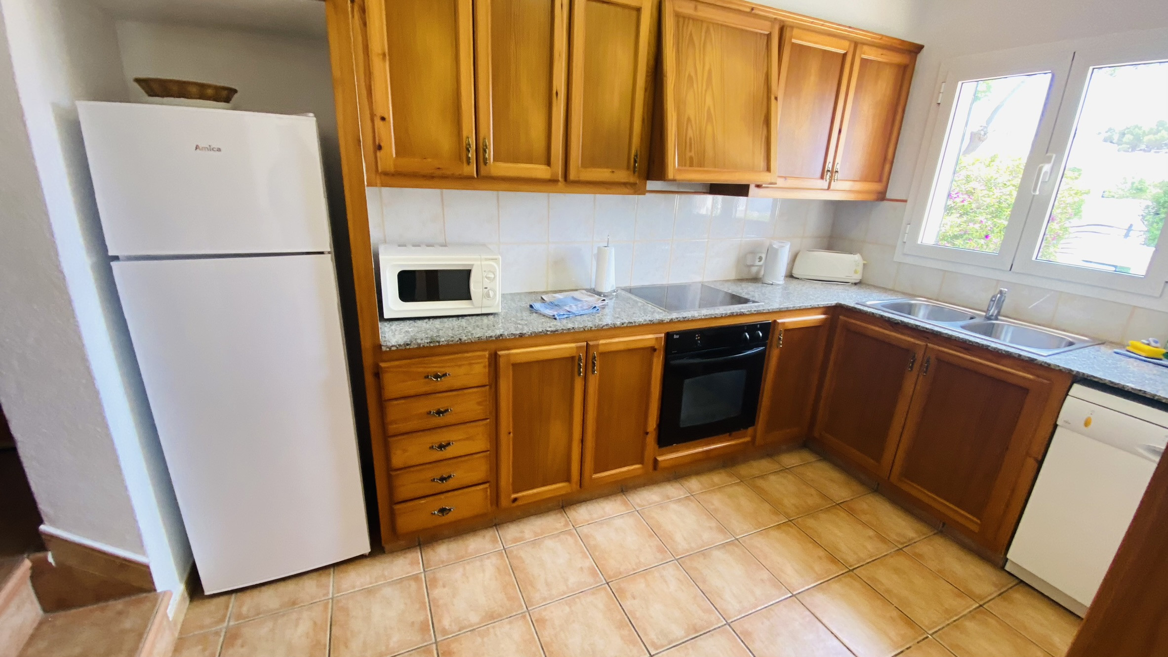 La cocina viene equipada con frigorífico-congelador, lavadora, lavavajillas, horno, microondas, tostadora y hervidor.