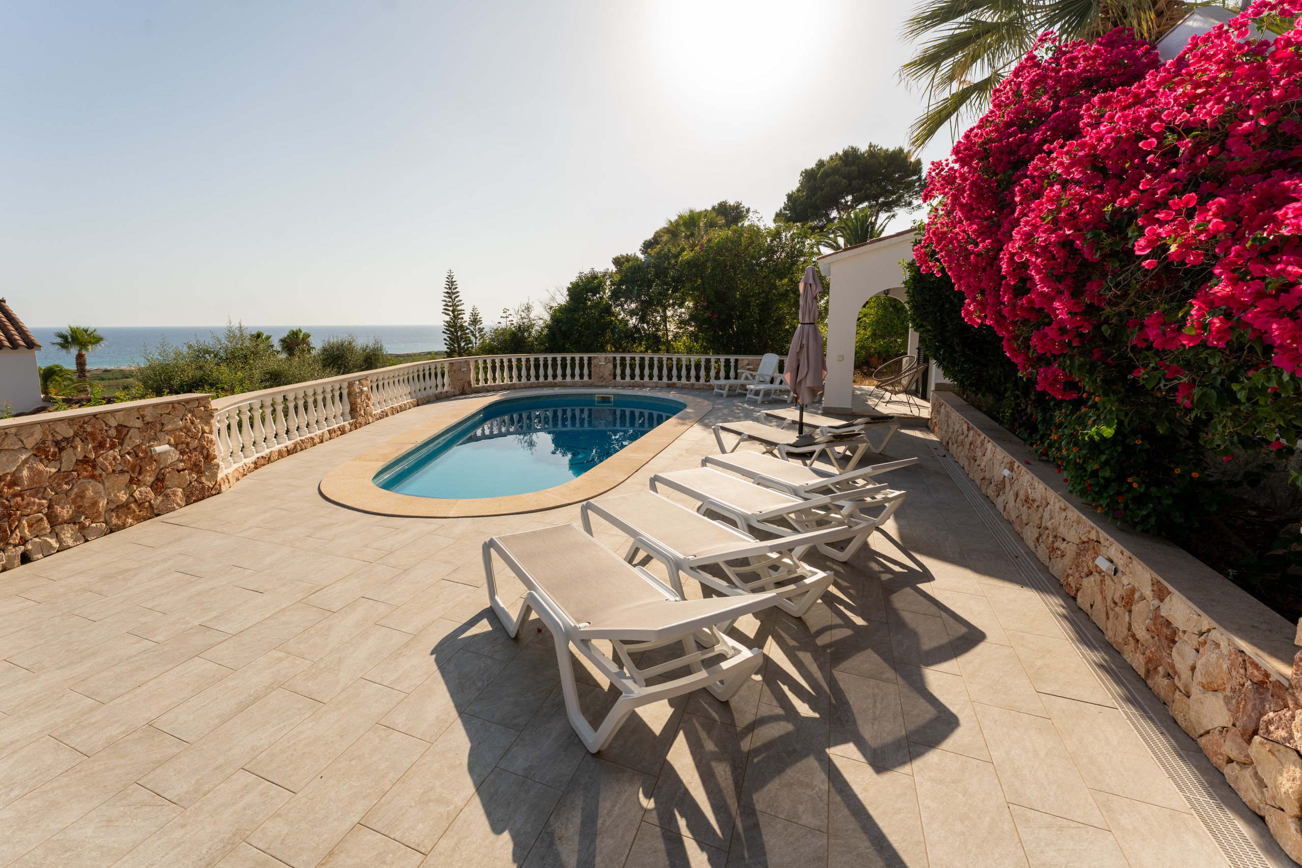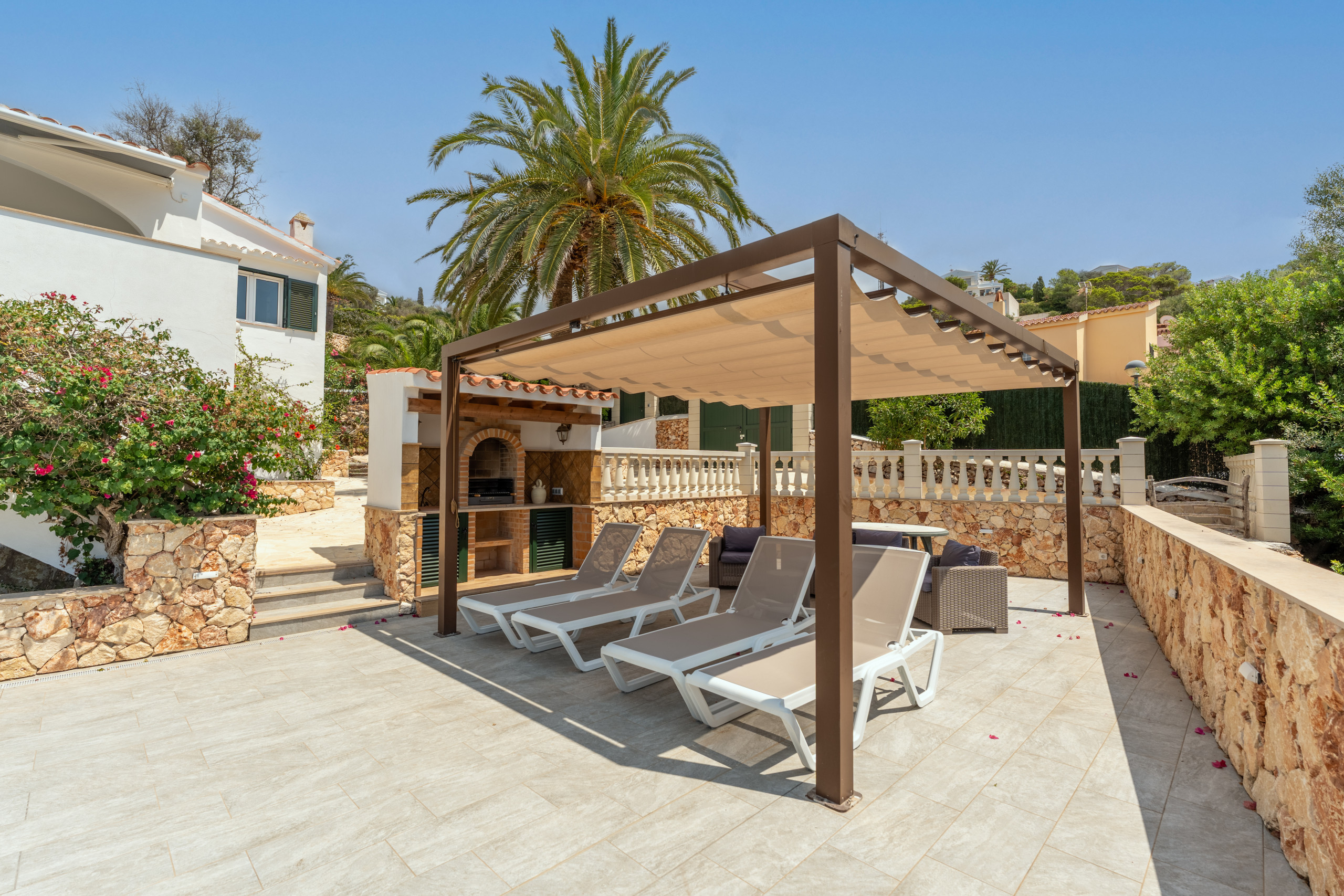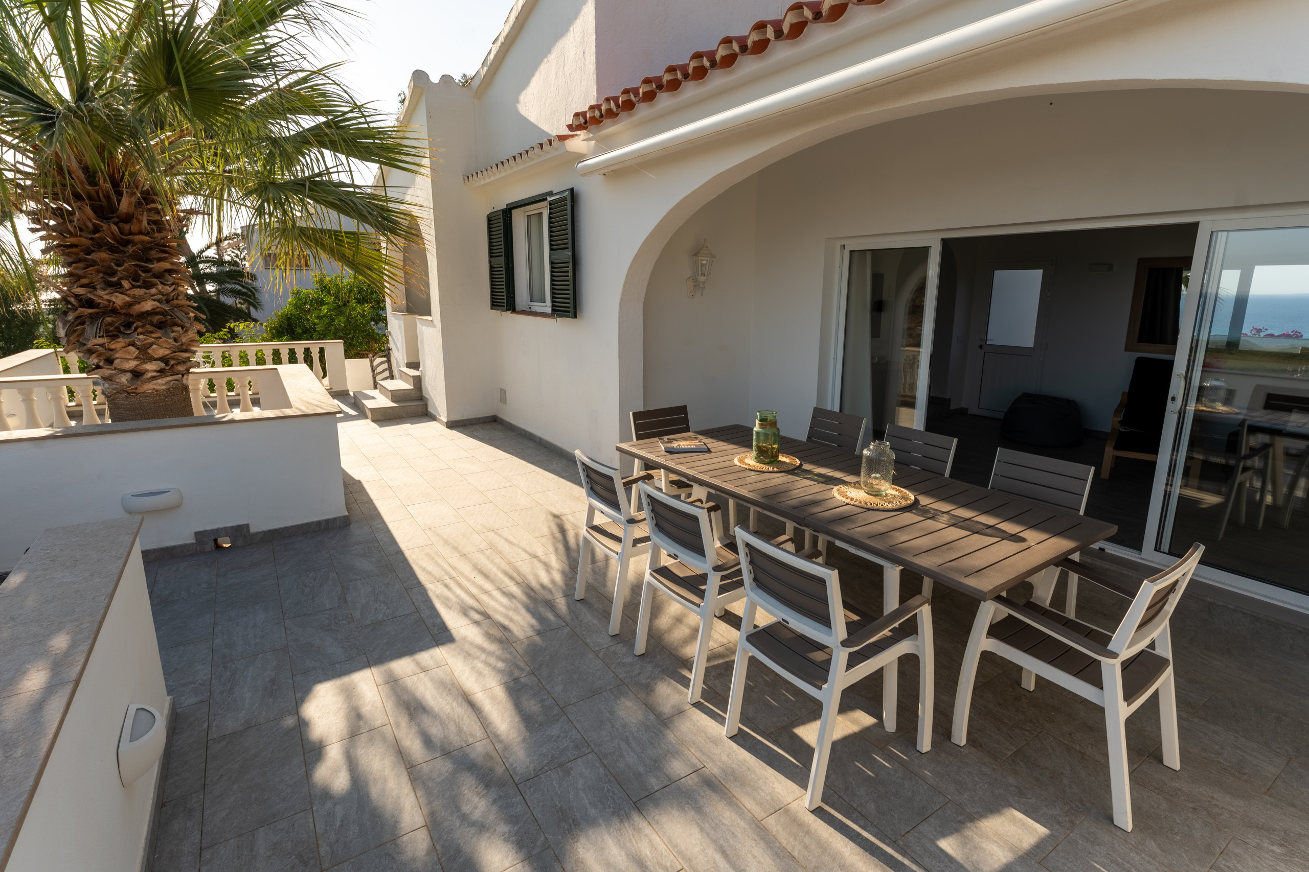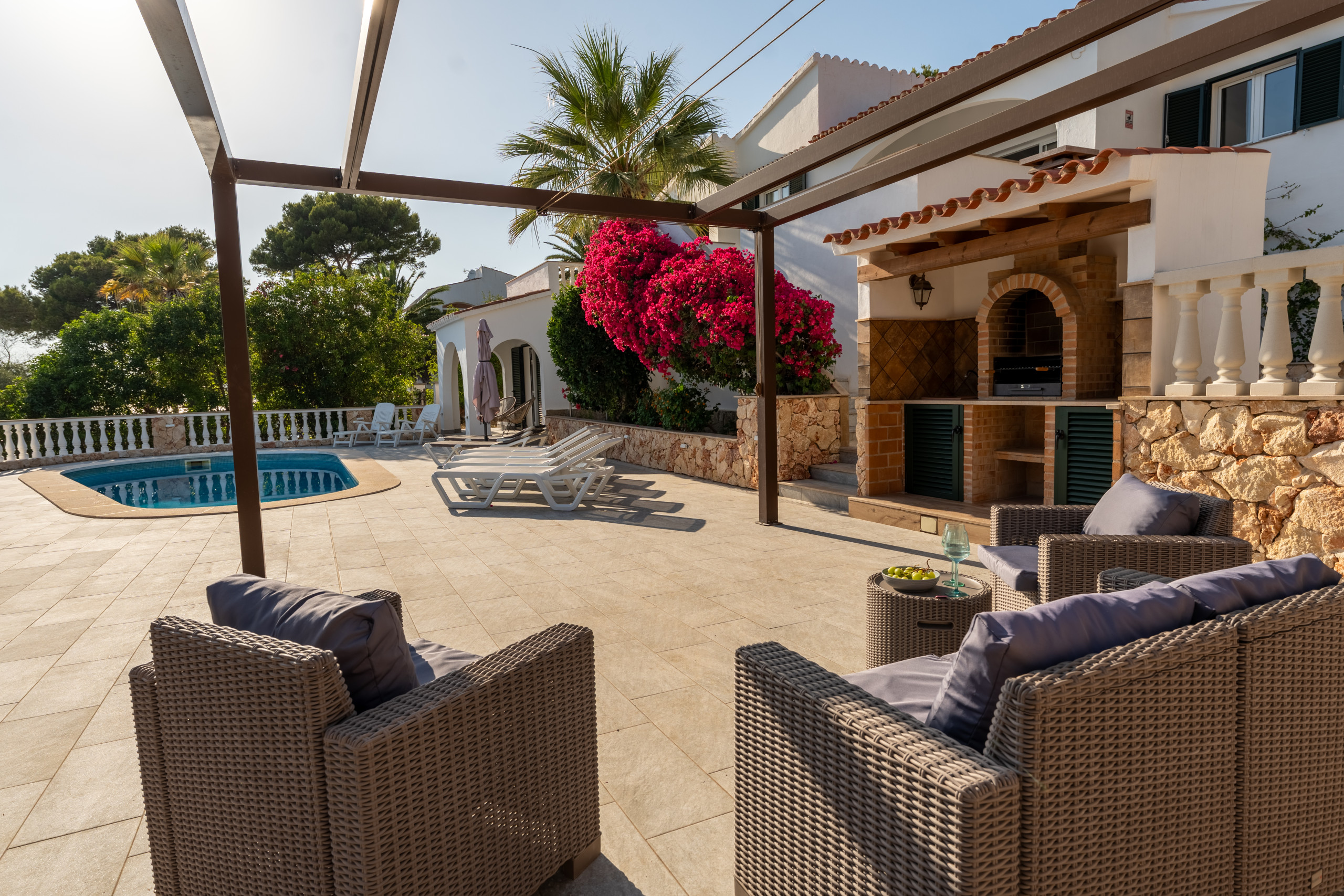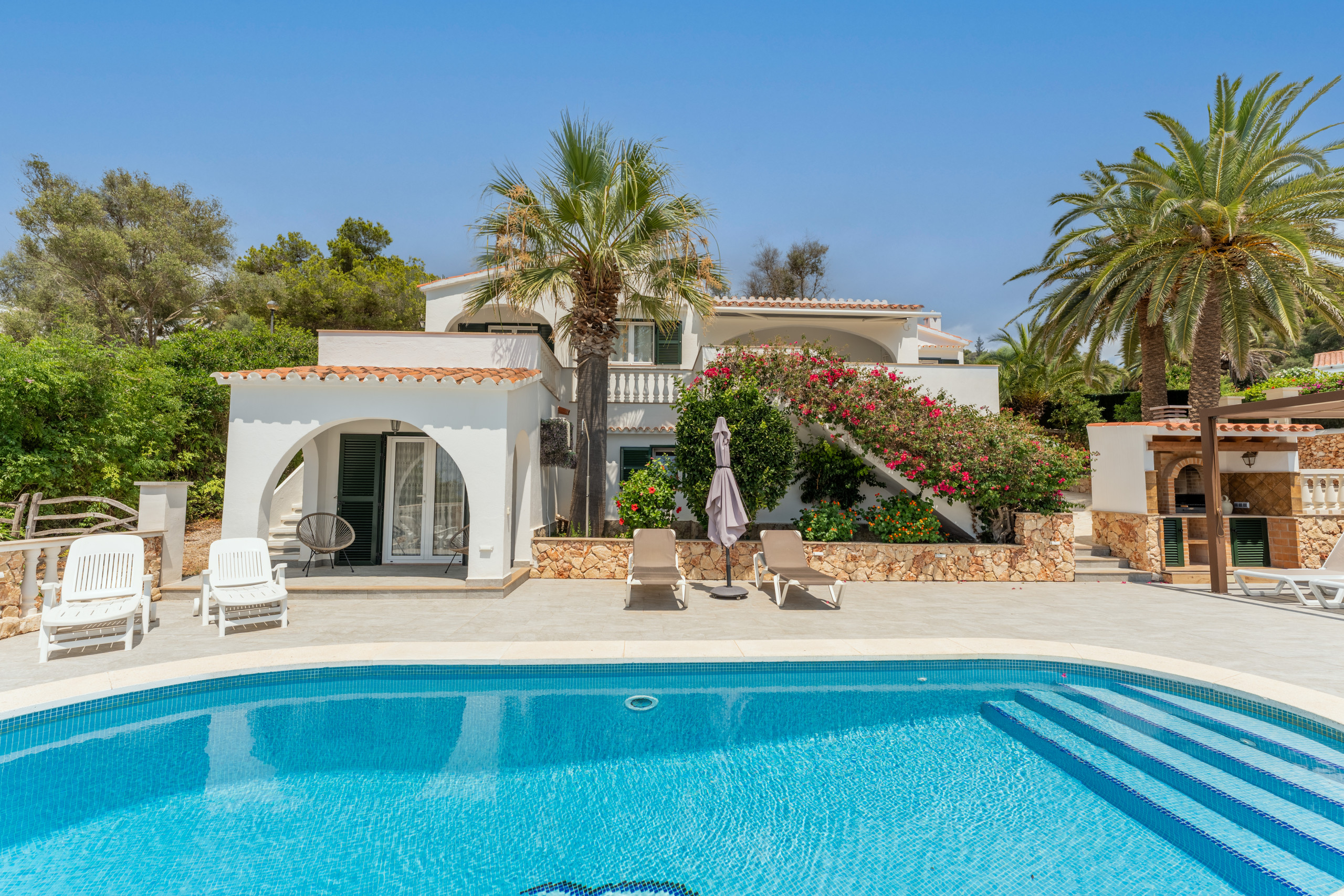 Nestled just 500 metres from the stunning Son Bou beach, this bright and tastefully furnished family villa offers an idyllic escape for up to 8 guests. Spread across 200 square metres of thoughtfully designed living space, this property promises a memorable Mediterranean holiday experience. It is about 10 minutes' walk to the beach. There are four bedrooms with a capacity for 8 people. Three bedrooms are on the first floor, sharing a shower room. On the floor below, at pool level, with a separate access, there is another bedroom and bathroom with bath and separate shower. The fourth bedroom cannot be accessed internally. For your added comfort, air-conditioning is provided in all the bedrooms. WIFI is included.
